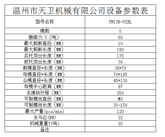您當前的位置:首頁 / 產(chǎn)品中心 / 五模五沖多工位冷鐓機 / └ TW13B(M8)多工位冷鐓機 / TW13B-5SXL全自動多工位冷鐓機